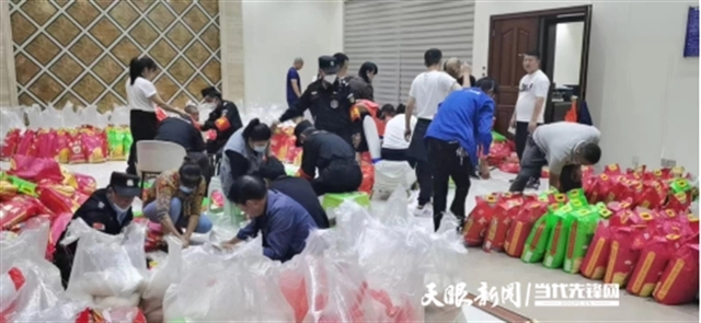 9月8日,貴陽市貴州天利機電城內,防疫工作人員和志愿者正在有條不紊地將防疫物資打包裝袋,免費發放給機電城里的每家商戶。