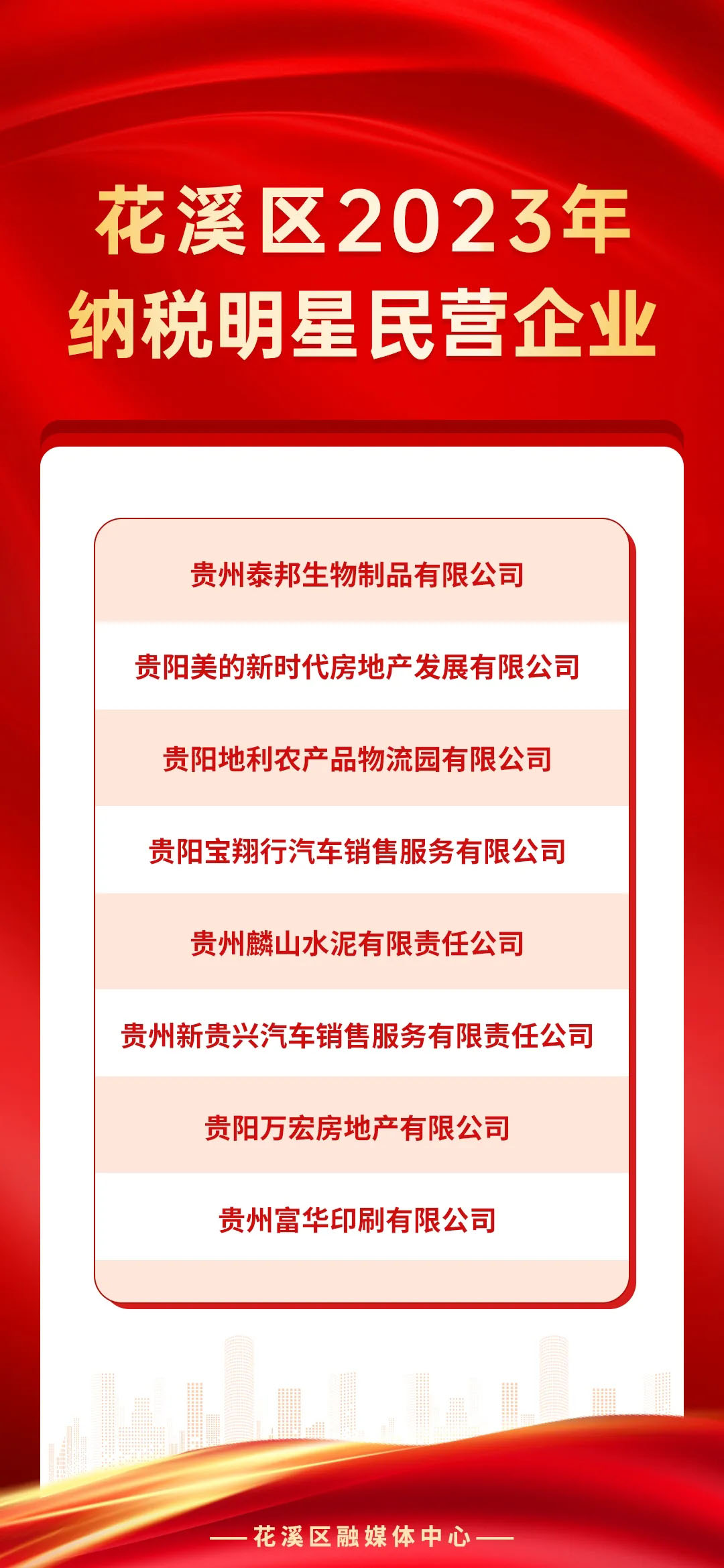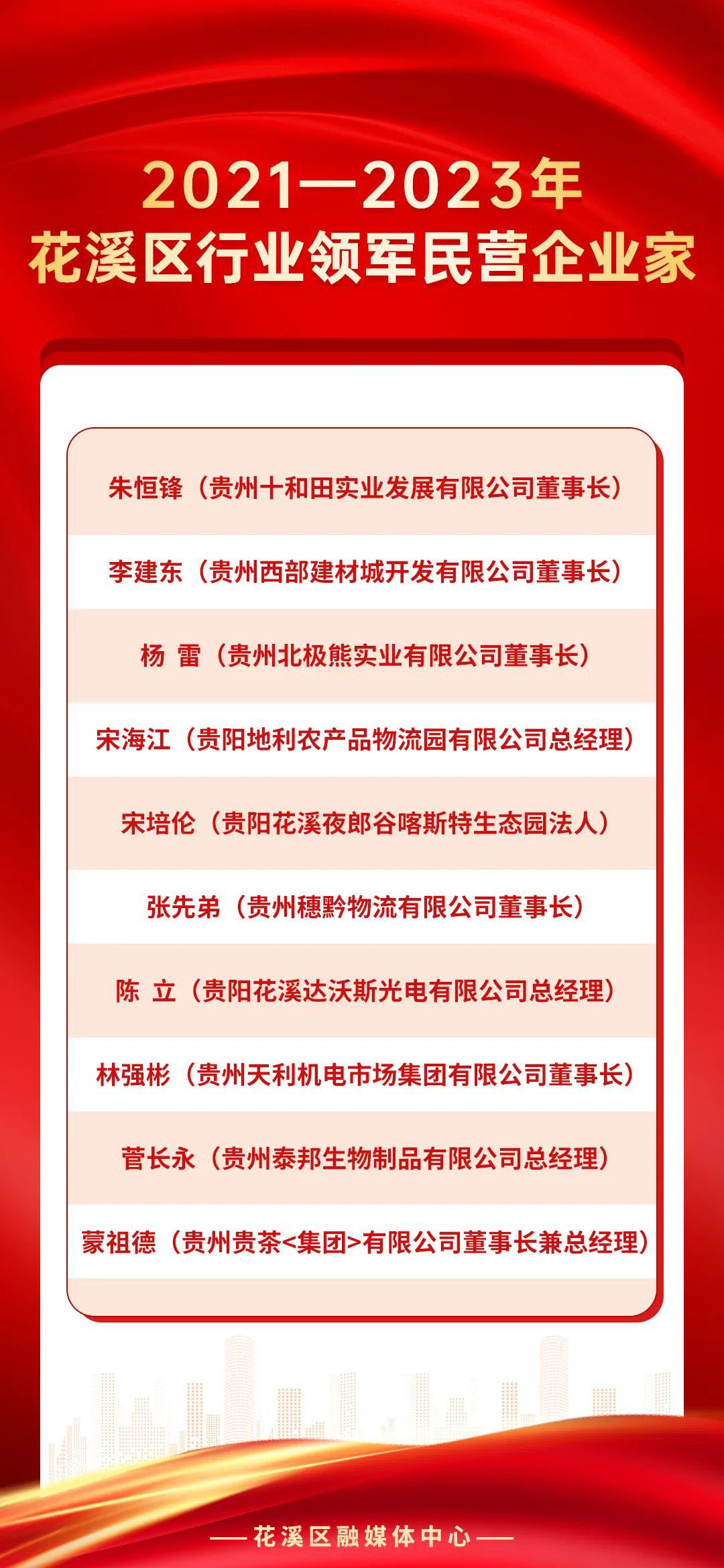 為表彰先進,激勵更多企業做強做優做大、積極投身花溪現代化建設新征程,花溪區服務民營經濟高質量發展工作領導小組決定,授予朱恒鋒等10名同志2021—2023年“花溪區行業領軍民營企業家”稱號;授予王開猛等10名同志2021—2023年“花溪區優秀民營企業家”稱號。授予貴州泰邦生物制品有限公司等8家民營企業“納稅明星”民營企業稱號。